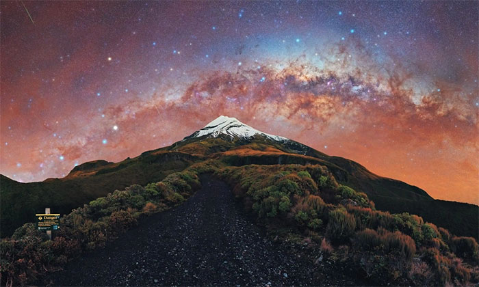 Bức ảnh chụp núi Taranaki (New Zealand) của tác giả Evan McKayGalactic Kiwi. Nhiếp ảnh gia này cho biết mình từng đến địa điểm này để quay chụp trước đây nhưng chưa ưng ý. Evan nghĩ mình có thể làm tốt hơn nên đã quay lại để thử lần nữa. “Mặc dù sự liên kết chưa hoàn hảo, đây cũng là bức ảnh đầu tiên của tôi trong năm. Thậm chí, lần này, tôi còn thấy một vài thiên thạch bay qua”, Evan nói.