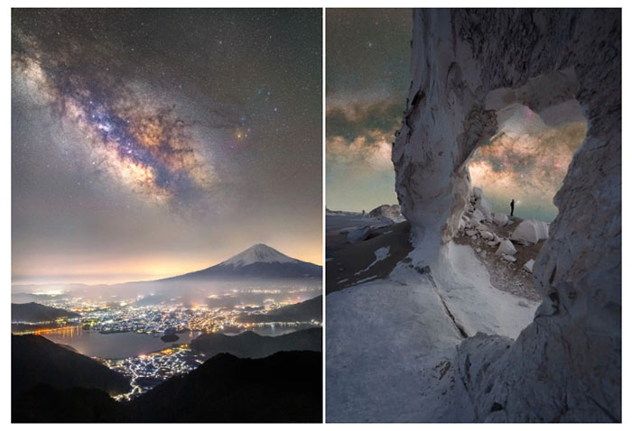 Ảnh trái, dải ngân hà vắt trên đỉnh núi Phú Sĩ (Nhật Bản). Bức ảnh được chụp vào khoảng 3h ngày 9/4. Đây là thời điểm duy nhất có thể chụp được khung cảnh này vào mùa xuân, với núi Phú Sĩ xa xa và dải ngân hà. Vào mùa đông, đường lên điểm chụp thường khó khăn do tuyết rơi. Ảnh phải, dải ngân hà vào buổi đêm ở một sa mạc tại Ai Cập.