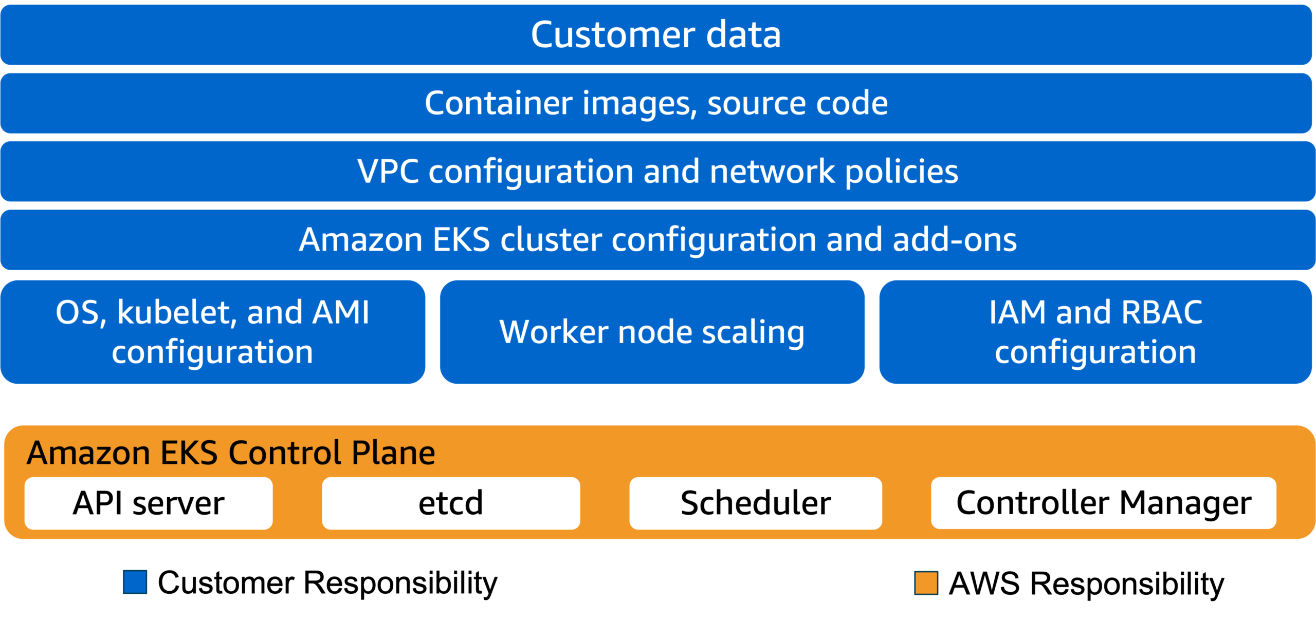 To learn more about how the Amazon EKS shared responsibility model works, interact with the image carousel below. Choose the right arrow to move to the next image, and the left arrow to move to the previous image. To use the zoom feature, choose the zoom image button.