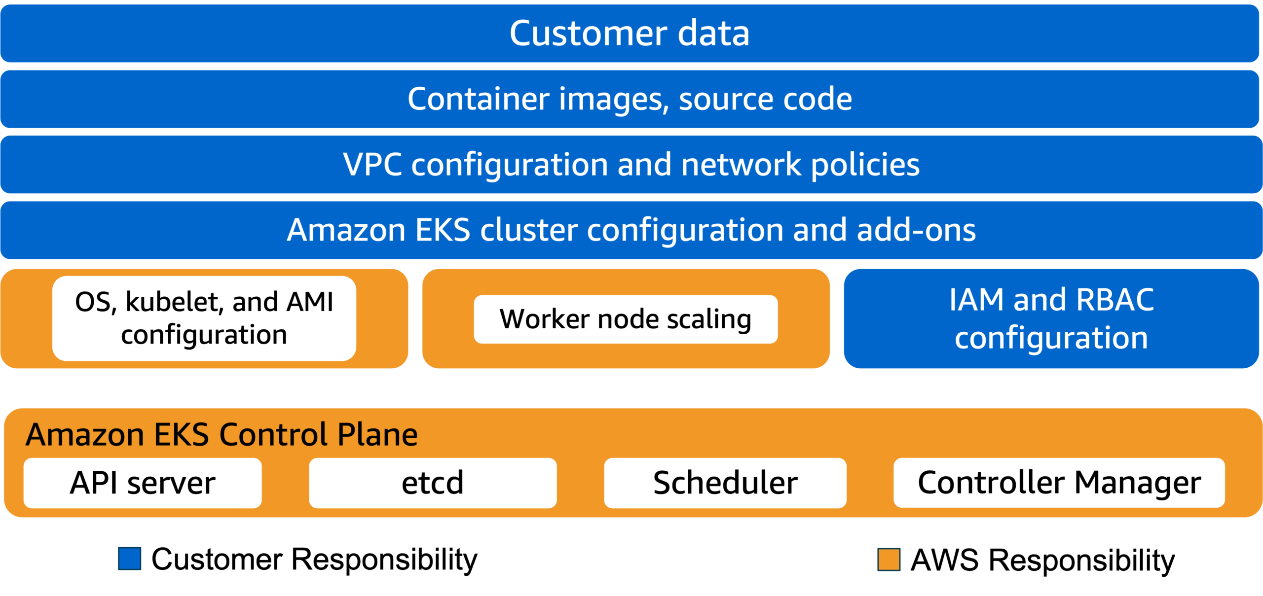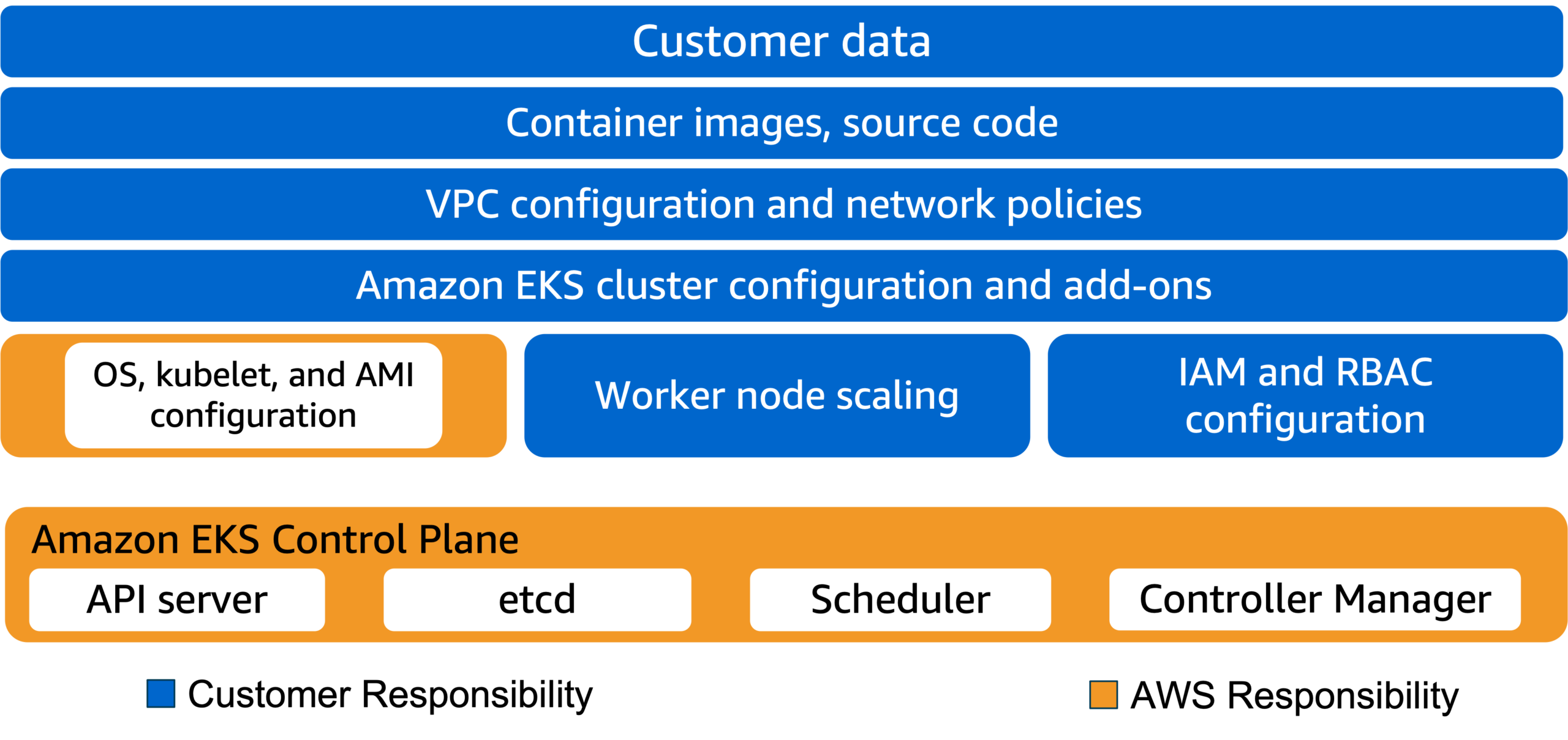 Customers maintain complete control over their content and are responsible for managing critical-content security requirements including customer content stored in AWS, the country in which the content is stored, who has access, and so forth. The type of Amazon EKS shared responsibility model is contingent on a customer’s choices for their cluster’s data plane.