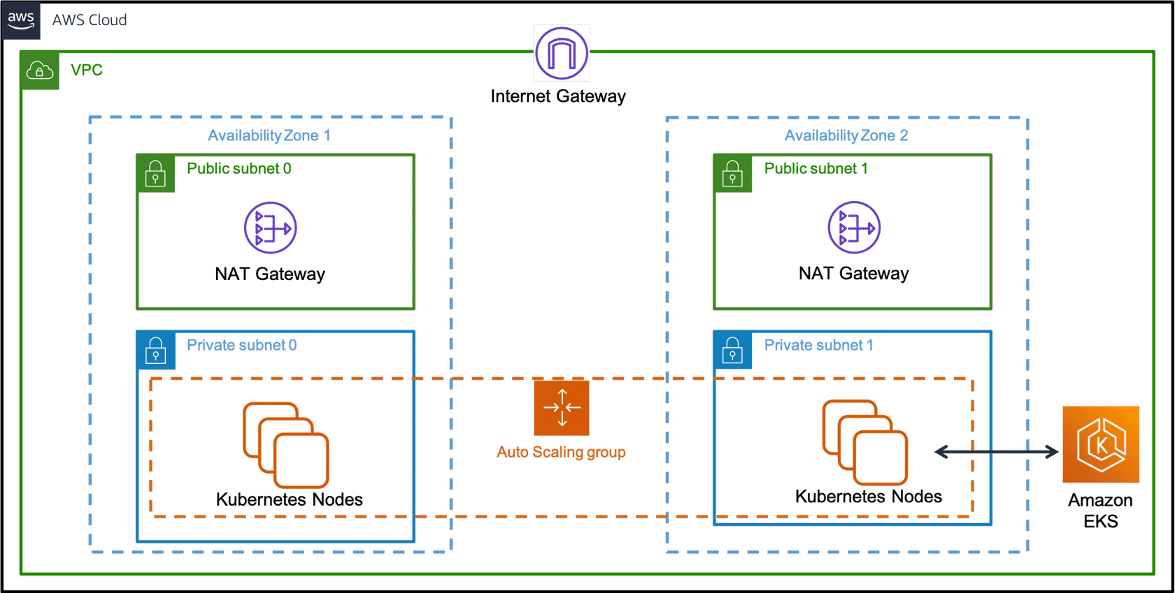 This VPC has two public subnets and two private subnets. One public and one private subnet are deployed to the same Availability Zone. The other public and private subnets are deployed to a second Availability Zone in the same Region. We recommend this option for all production deployments. With this option, you can deploy your worker nodes to private subnets. Kubernetes can deploy load balancers to the public subnets. These load balancers can balance traffic to pods running on worker nodes in the private subnets.